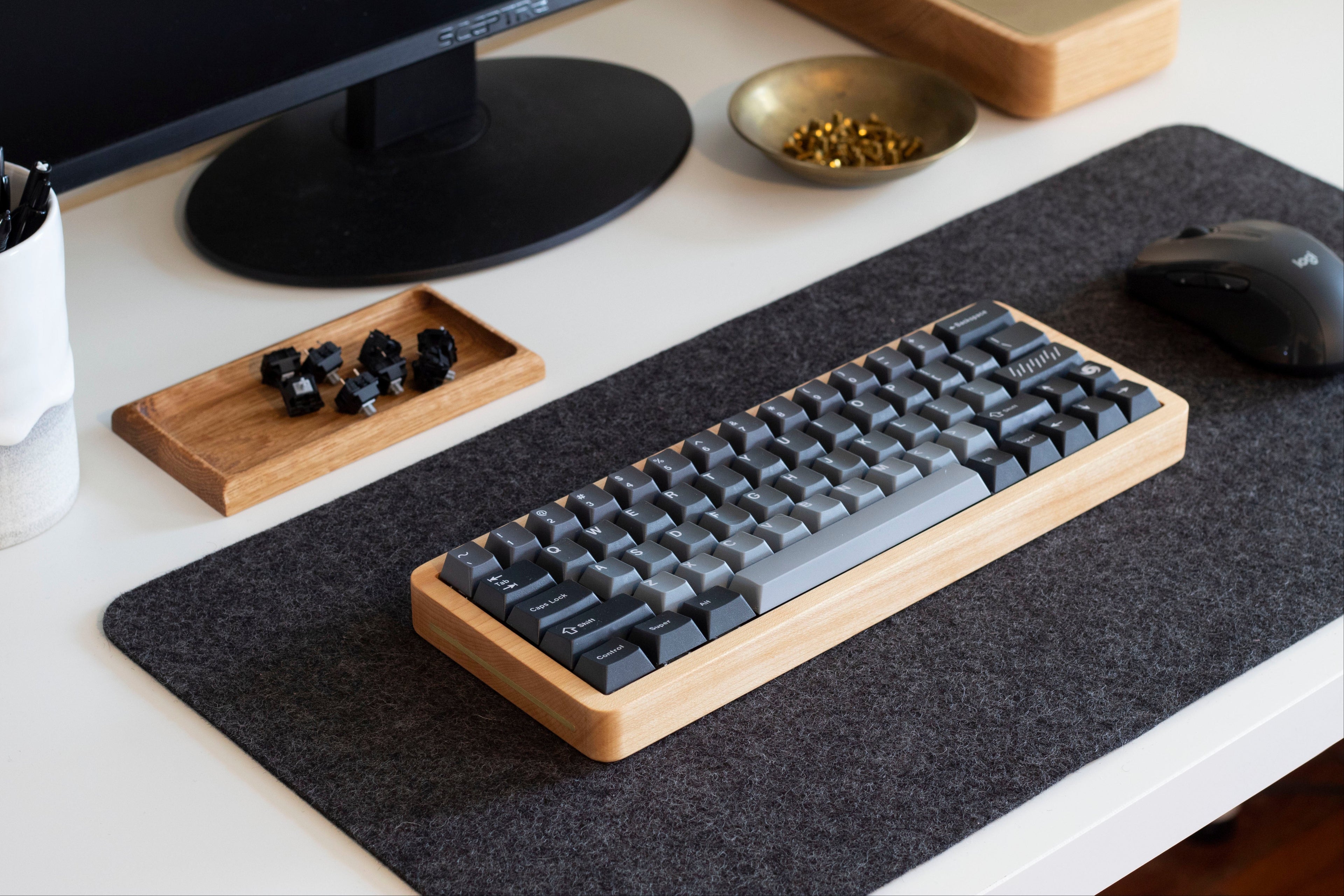 I purchased a maple 65% keyboard case with chamfered edges and brass accents. The case is very well-made, and light and smooth to the touch. Those who want a more refined appearance to their board might prefer a walnut or oak case, but I like maple -- it just feels more refreshing and minimalist. I also picked up some brass keyboard feet and they really add something to the overall board. Picked up a PCB at YMDK and it fits beautifully. Can't recommend this purchase enough.
